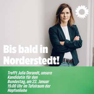 Komme vorbei und lerne Julia Dorandt kennen, unsere Grüne Direktkandidatin für den Wahlkreis 8 in Segeberg und Stormarn Mitte. Wir freuen uns auf alle Teilnehmenden und eine gute Diskussion.