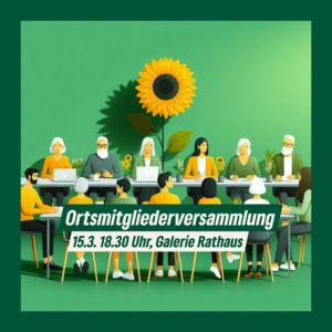 Komme vorbei und bringe dich ein! Am 15.03. findet in der Galerie im Rathaus unsere erste Ortsmitgliederversammlung (OMV) in 2024 statt. Die Tagesordnung wird wie gewohnt 2 Wochen vor der Versammlung via E-Mail an alle Mitglieder verschickt. Hast du weitere Themen, die dich bewegen? Komme vorbei! Du bist Neu-Mitglied und möchtest andere Grüne kennenlernen, komme ebenfalls gerne vorbei! Wir freuen uns auf euch!