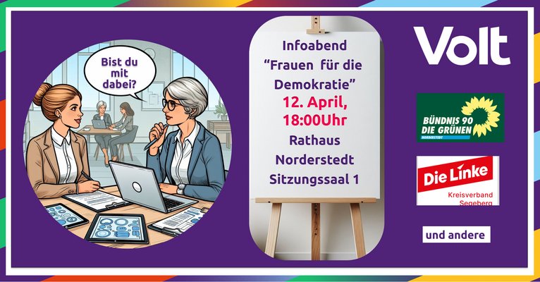 Die Partei Volt lädt zu einer Informations- und Diskussionsveranstaltung “Frauen für die Demokratie" am 12.04. 18 Uhr im Rathaus Sitzungssaal 1 ein (Link). Frauen aus unterschiedlichen Parteien geben Einblick in ihren politischen