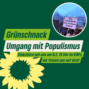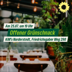 Der nächste Grünschnack findet am 22.08. ab 19 Uhr im KiM's, Friedrichsgaber Weg 290 statt. Über alle Themen, die dich bewegen, vernetze dich mit anderen Grünen und Grün-Interessierten. Anmeldung unter Termine: