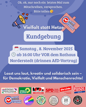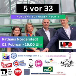 Wir freuen uns über das breite Bündnis von 5 vor 33 (www.5vor33.com) zur Kundgebung am 2.2. 16 Uhr auf dem Rathausplatz in Norderstedt Mitte. Wir danken dem Kinder- und Jugendbeirat (KJB) und dem Lesben- und Schwulenverband Schleswig-Holstein e.V. (LSVD SH) für das Engagement und die Organisation, wir unterstützen gerne! Wir hoffen auf rege Beteiligung durch viele Vereine, der Politik und zahlreichen Norderstedter*innen, die unsere Demokratie schützen wollen. Es ist Zeit auch in Norderstedt ein Zeichen gegen Rechtsextremismus zu setzen. Insbesondere freuen wir uns, dass sich auch einige andere (wenn auch noch nicht alle) demokratischen Parteien (SPD, FDP und Volt) aus dem Norderstedter Rathaus dem Bündnis 5 vor 33 angeschlossen haben. Wir hoffen, dass sich alle demokratischen Parteien Norderstedts geschlossen an diesem Tag zur Demokratie und gegen Faschismus zu bekennen.