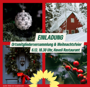 It's beginning to look a lot like Christmas! Daher freuen wir uns auf euch zur Ortsmitgliederversammlung und anschließender Weihnachtsfeier am 6.12. um 18.30 Uhr im Restaurant Haveli, Ulzburger Str. 476 a. Wir hoffen auf eine rege Teilnahme. Besonders für die zahlreichen neuen Mitglieder ist dies eine gute Gelegenheit zum Kennenlernen. Wir werden den Haushalt besprechen, unsere Pläne für den kommenden Bundestagswahlkampf vorstellen und Möglichkeiten zeigen, wo ihr in dieser wichtigen Zeit unterstützen könnt. Wir sehen uns am 6.12.! Anmeldung wie gewohnt unter: