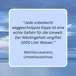 „Jede unbedacht weggeschnippte Kippe ist eine echte Gefahr für die Umwelt, denn ihr Nikotingehalt vergiftet 1000 Liter Wasser so stark, dass z.B. Wasserflöhe sterben. Es braucht zudem mindestens 10 Jahre, bis sie verrottet ist. Und außerdem verstärken die Kunststofffilter das Mikroplastikproblem.“